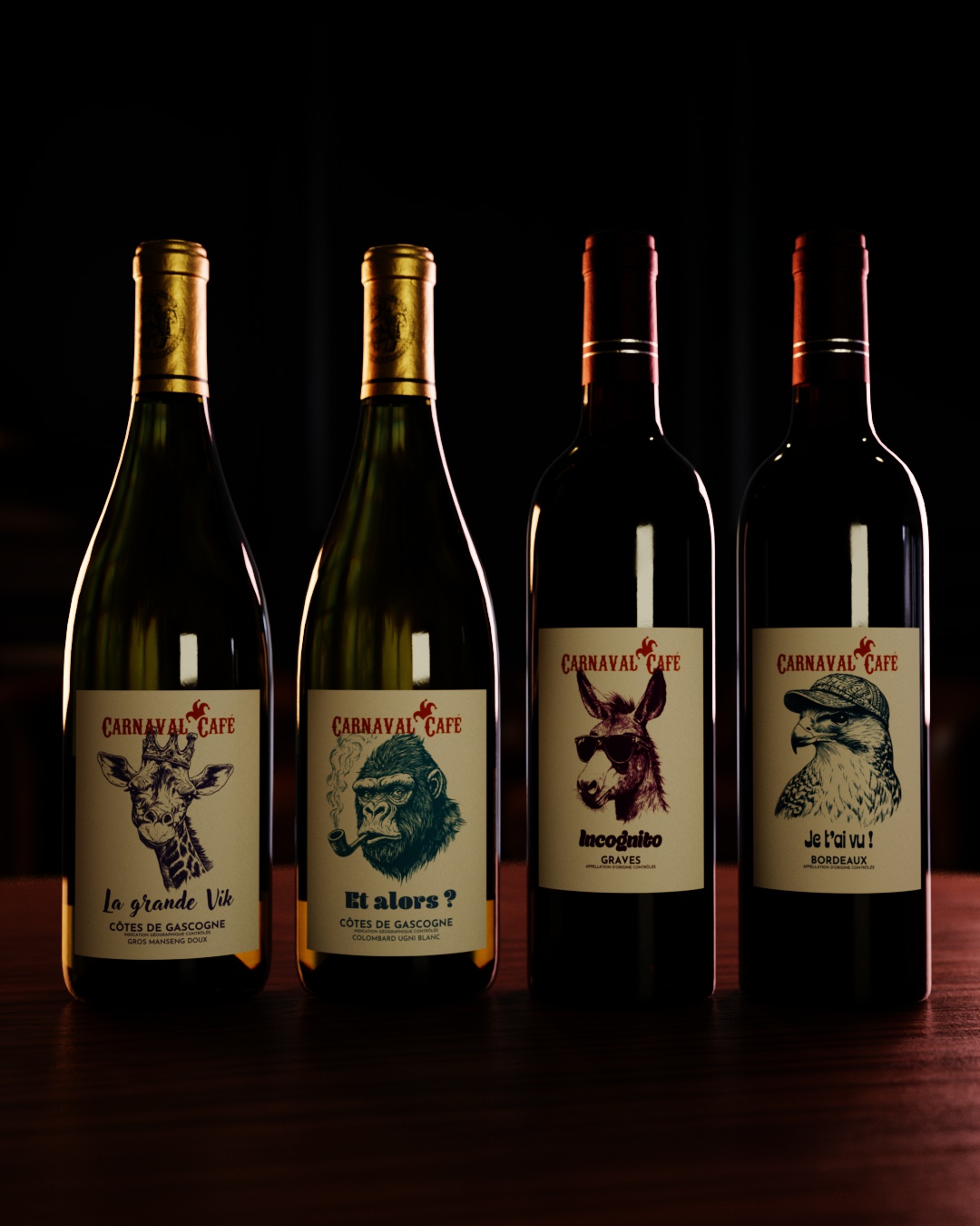 S’il existe encore un univers dans lequel le graphisme peut s’exprimer, c’est bien celui du vin. L’établissement Carnaval Café de Bordeaux nous a confié la création de 4 étiquettes de vin afin de personnaliser leur collaboration avec les viticulteurs partenaires. Quel plaisir de retrouver les crayons et les coups de gomme pour la création d’illustrations décalées, contenant toutes un petit clin d’oeil au lieu… mais il faut être bordelais pour apprécier ce second degré.